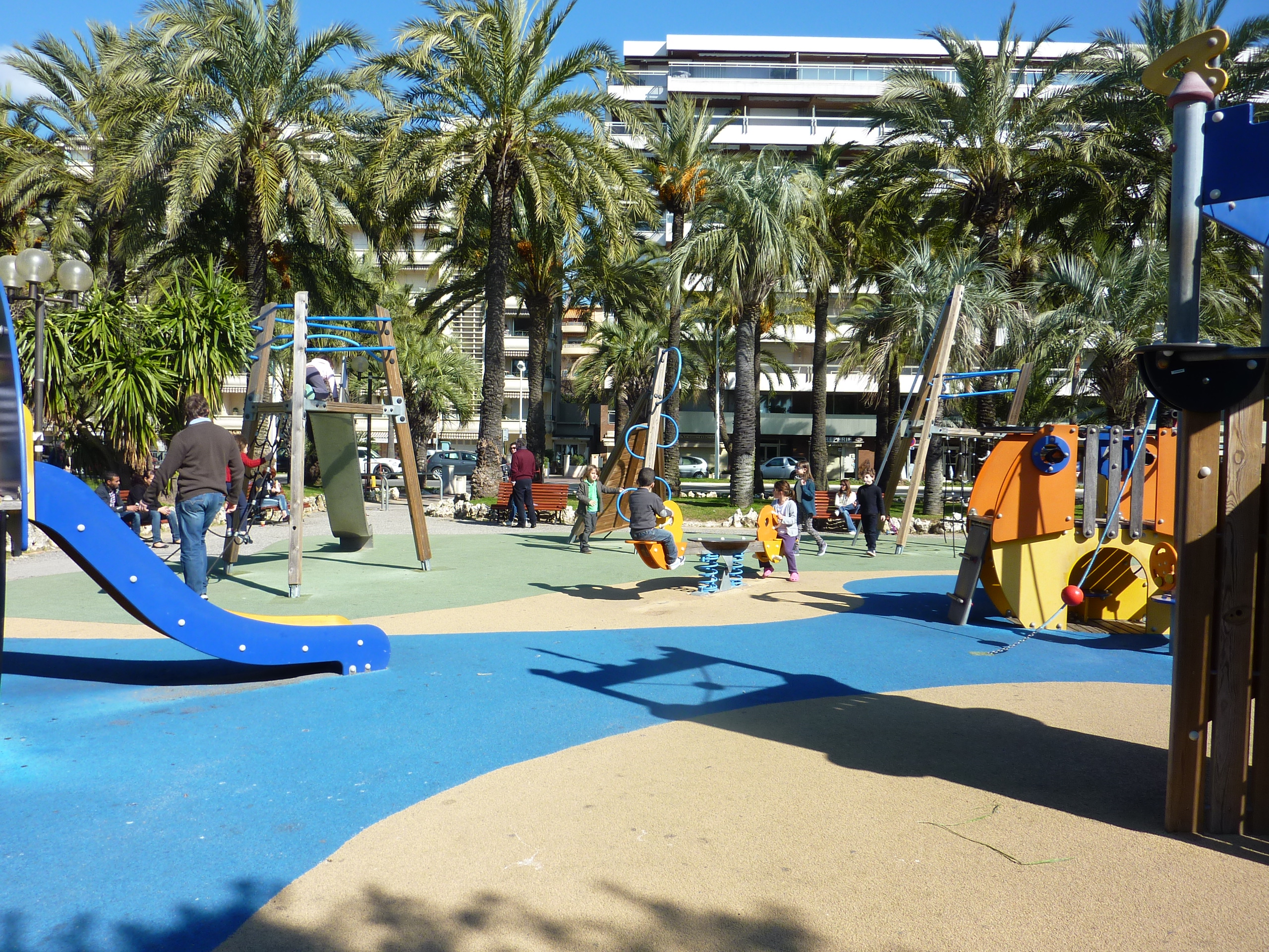 L’aire de jeux sur le thème de… devinez… la MER bien sur et les bateaux (avant d’arriver sur la Croisette bordée des ces hôtels de luxe et de ces baraques à paninis et à glaces mais surtout la MER). Il y a aussi un petit manège et un trampoline.Cette aire est destinée aux enfants à partir de 2 ans mais même 18 mois ça va. Personnellement, Puce grimpe bien et descend bien les toboggans. Donc escalade des marches en bois OK. Ce jour-là, des petites filles jouaient à boire le café avec leur tante, ce qui a fasciné Puce.