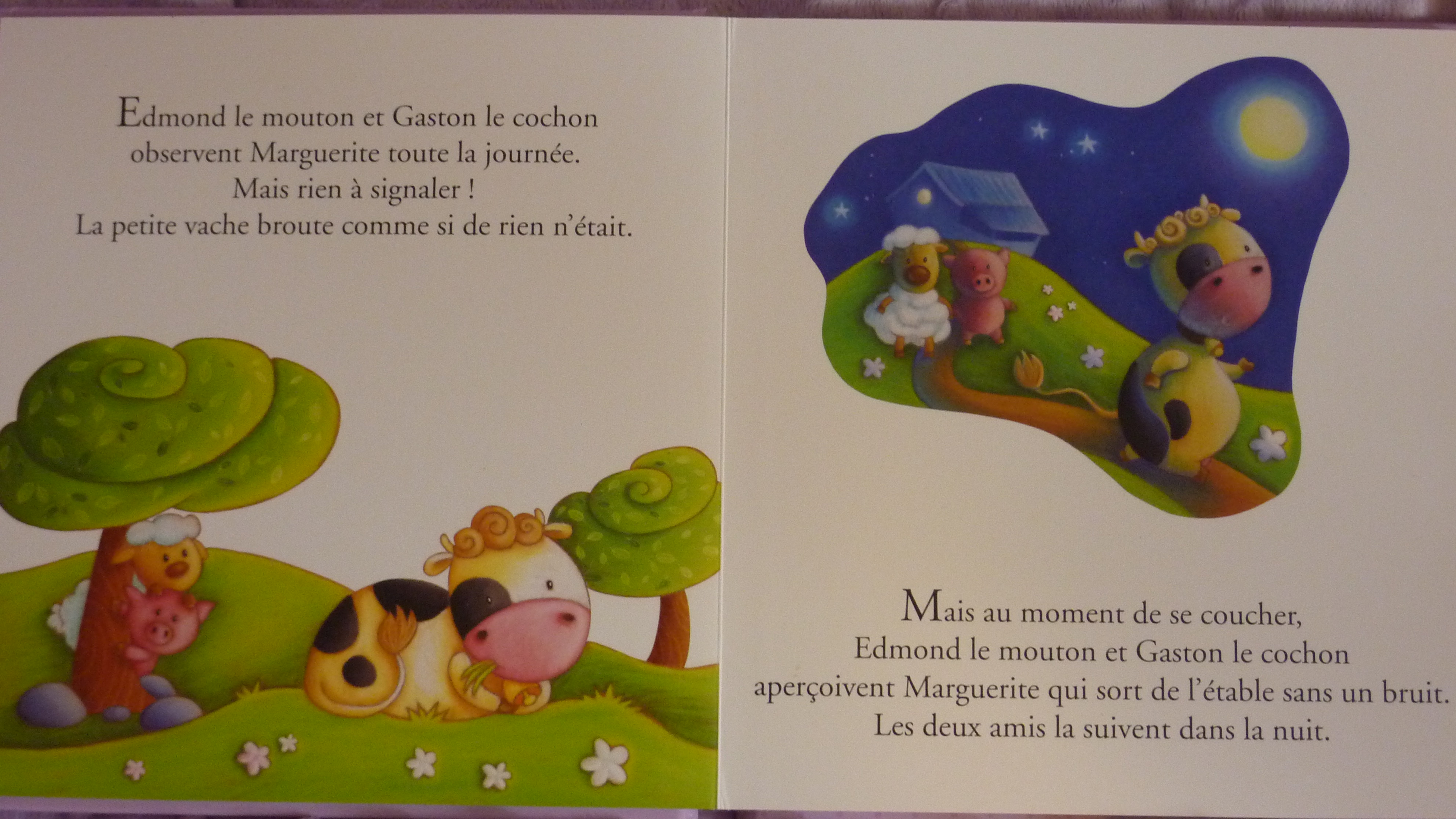 Le secret de Marguerite, une petite vache qui dort dans le pré la journée car la nuit elle sort de l’étable pour regarder les étoiles dans le ciel. Elle est espionnée par ses amis Edmond le mouton et Gaston le cochon qui se joignent ensuite à elle. L’occasion pour Puce et moi de regarder le plafond en disant qu’il y a plein d’étoiles là-haut. Quand arrive le passage sur les étoiles, je hausse la voix et je montre le plafond : « Je regarde les étoiles dans le ciel ! répond la vache. » Comme si c’était fabuleux, je joue le grand enthousiasme ! Et elle aussi !