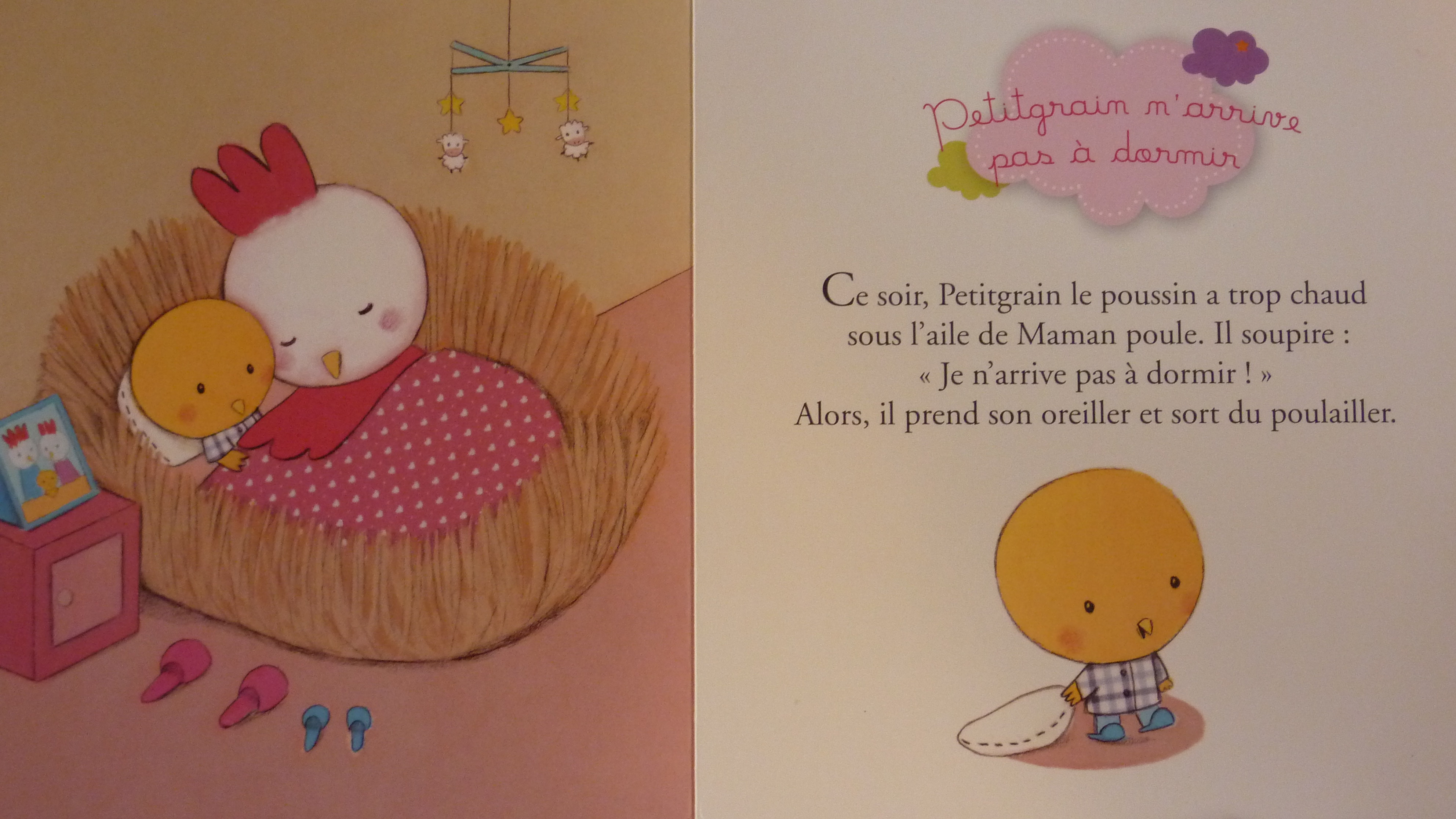 Seconde histoire : Petitgrain n’arrive pas à dormir. Parfait pour imiter les bruits des animaux, type ronflements et rêves ! Petitgrain le poussin a trop chaud sous l’aile de Maman poule alors il va voir ailleurs s’il arrive à dormir. Malheureusement pour lui, au bord de l’eau chez Nénuphar le canard les grenouilles chantent (entonner le « Coâ, coâ, coâ ») ; chez Pépin le lapin les rêves de carottes sont bruyants (« cric, crac, croc… ») et chez Bouchon le cochon il y a trop de ronflements. Finalement, Petitgrain est mieux sous l’aile de Maman poule et « s’endort enfin ».