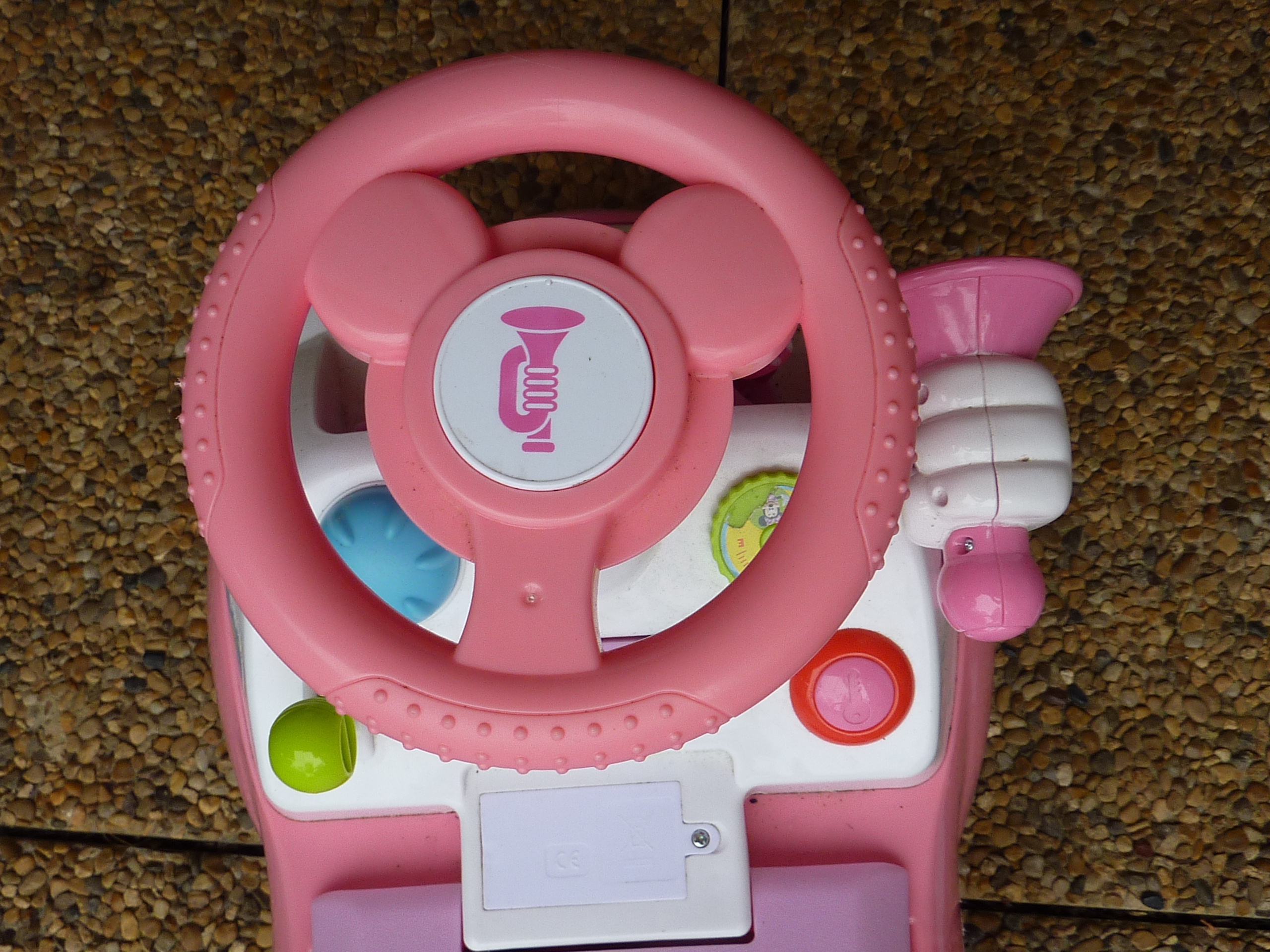 Voici le véhicule (après les poussettes de toutes tailles) préférée de Puce depuis l’été dernier (ses 15/16 mois). Elle a bien un vélo tricycle (pas terrible) et une moto (elle était encore trop petite à 15 mois pour en profiter) mais sa voiture Minnie elle l’adore.