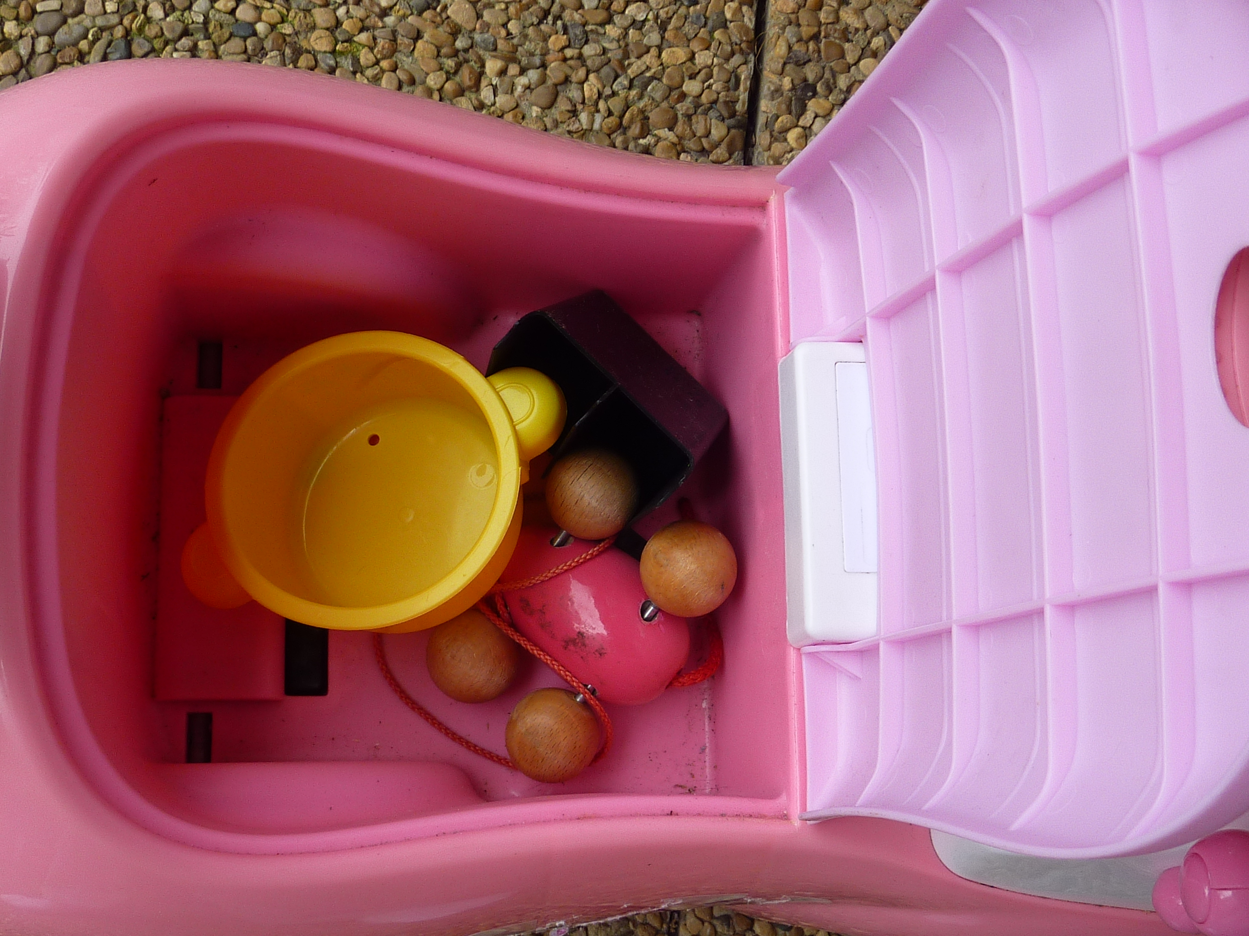 Il est également muni d’un coffre où elle fourre ce qui lui passe sous la main. En ce moment on y trouve : une casserole de dinette, une petite souris à tirer avec sa ficelle et un bloc noir. J’y ai déjà retrouvé son hochet Minnie, d’ailleurs où est il passé celui-là ? Et mon double des clés de l’appartement. Il est doté d’un sabot à l’arrière pour éviter que le tout ne bascule. Il y une poignée pour qu’elle puisse le pousser ou se faire pousser mais comme elle est un peu basse on ne peut pas faire des kilomètres avec dans un parc. En tous cas un bon porteur pour la maison ou pour de belles minutes de jeu à l’extérieur. Elle ne s’en lasse pas, je vais penser à lui présenter de nouveau sa petite moto et à acheter un beau tricycle.