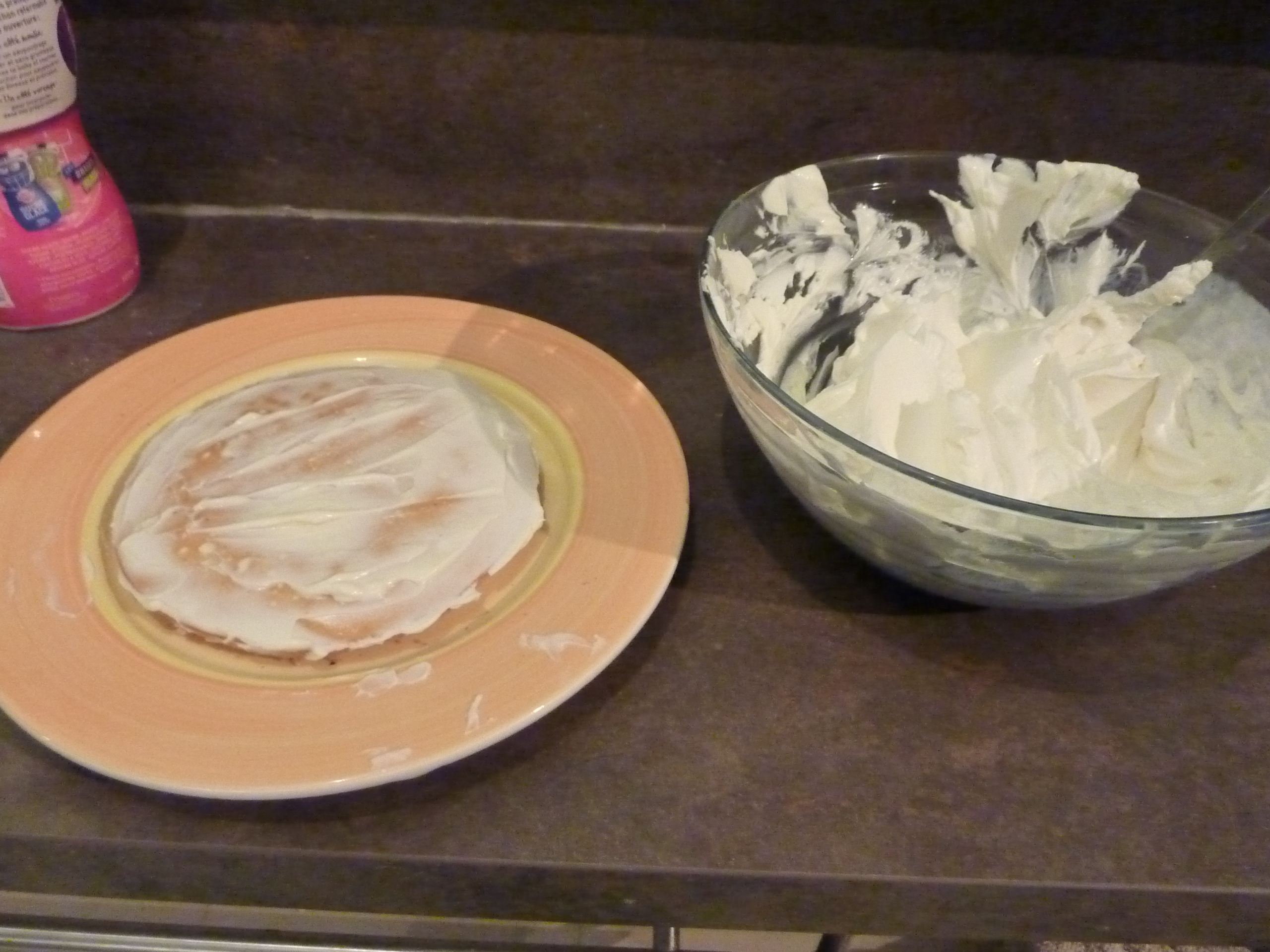 4/ Attendre que ça refroidisse (c’est ça qui est long, et je n’ai qu’un moule) ; déposer la génoise sur une assiette (ou dentelle) bien la tasser (ça m’a aidé car sinon le tout est bancal) et mettre du glaçage à la spatule (recette ici toujours ou la).