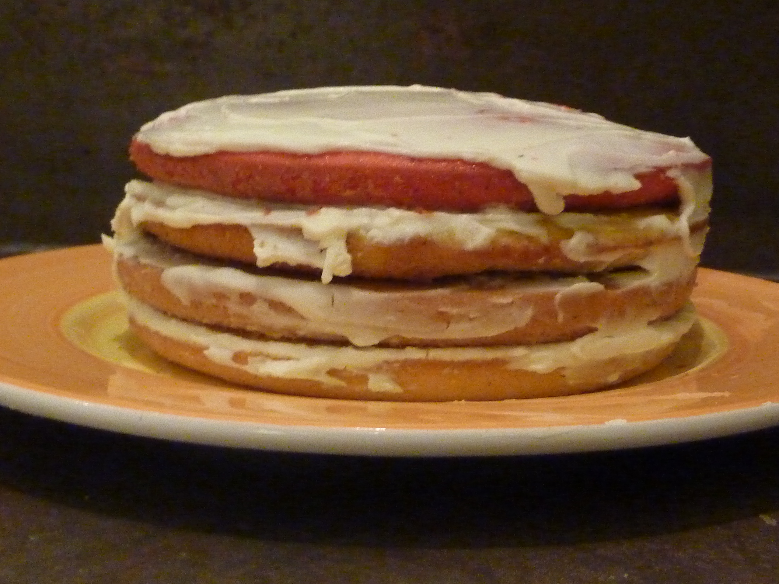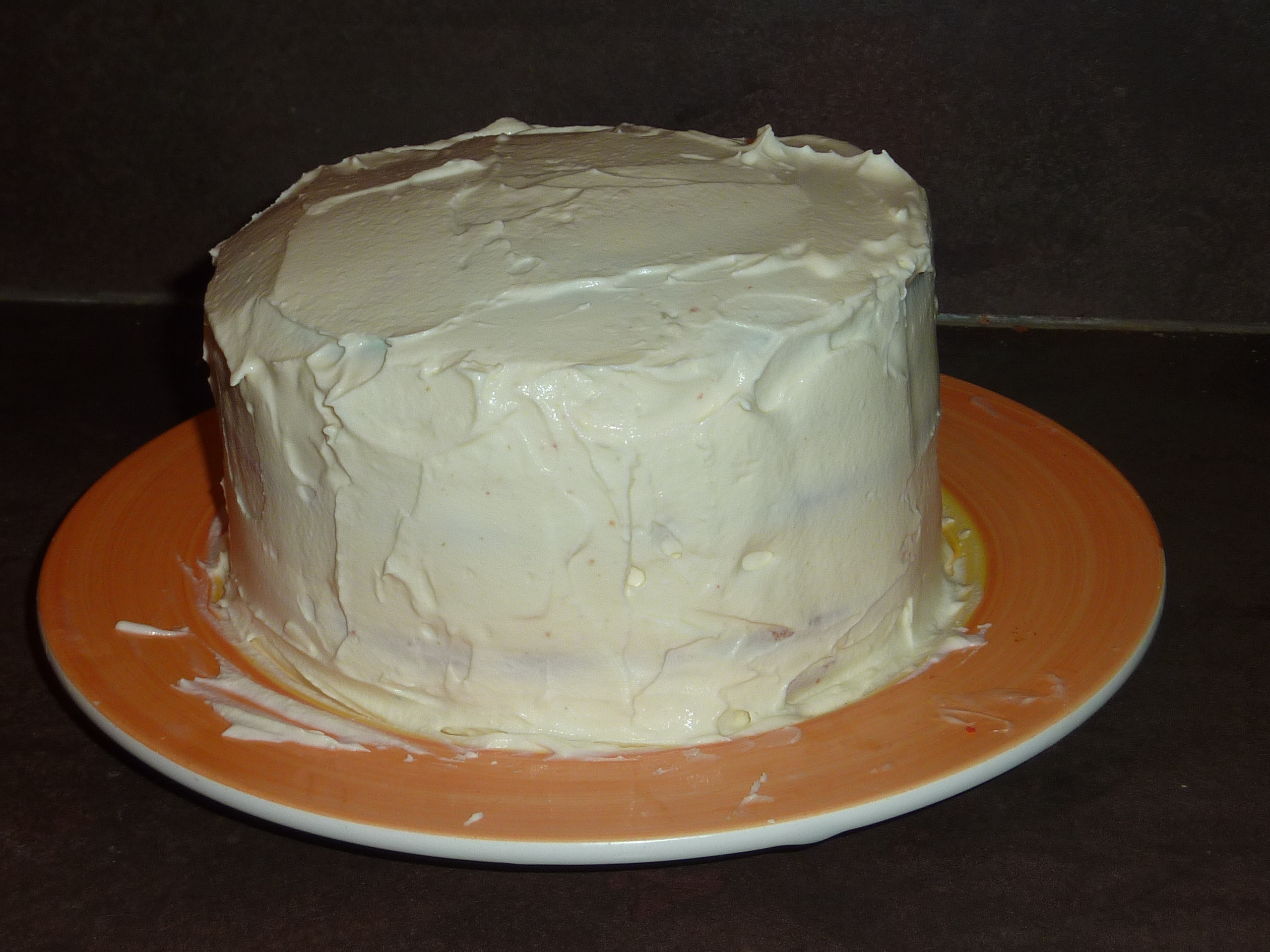 5/ Faire la même chose avec les 5 génoises restantes et on rajoute le glaçage tout autour d’une main de maitre, et hop le tout au frigo une nuit ou quelques heures. (dans la réalité j’en ai eu marre et peur de rater le glaçage donc je l’ai rajouté le lendemain matin et re au frigo).