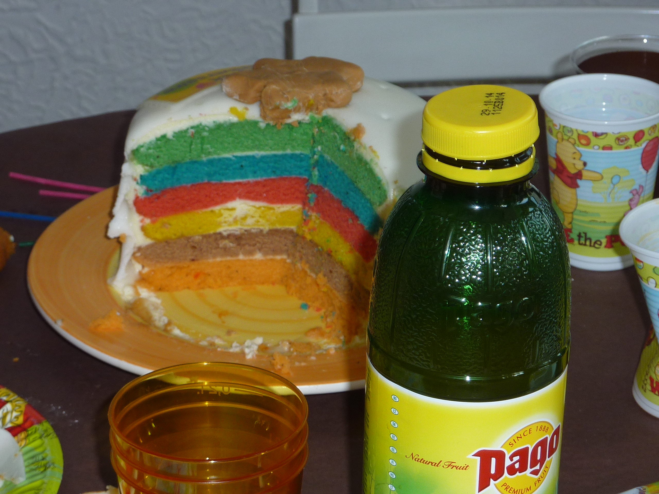 Pour les enfants j’ai tenté un RAINBOW CAKE (the first time) en suivant la recette d’une blogueuse (La Reine de l’iode) et les conseils de préparation d’un autre blog. J’avais envie de faire un gâteau coloré, enfantin et d’utiliser de la pâte à sucre car je n’ai jamais eu l’occasion d’en réaliser et je ne suis pas très forte en pâtisserie. Occasion toute trouvée ! Pour les adultes, on a pu gouter au rainbow cake, et il y avait aussi une mousse aux fruits et pour la fin de la journée des pizzas et des brochettes de fruits, un genre d’apéro. Pour le buffet des enfants, pas de sweet table compliquée juste mes assiettes et ma déco Winnie, et des bonbons, chamallow, des petits oursons de Lu à la fraise et des oursons guimauve.