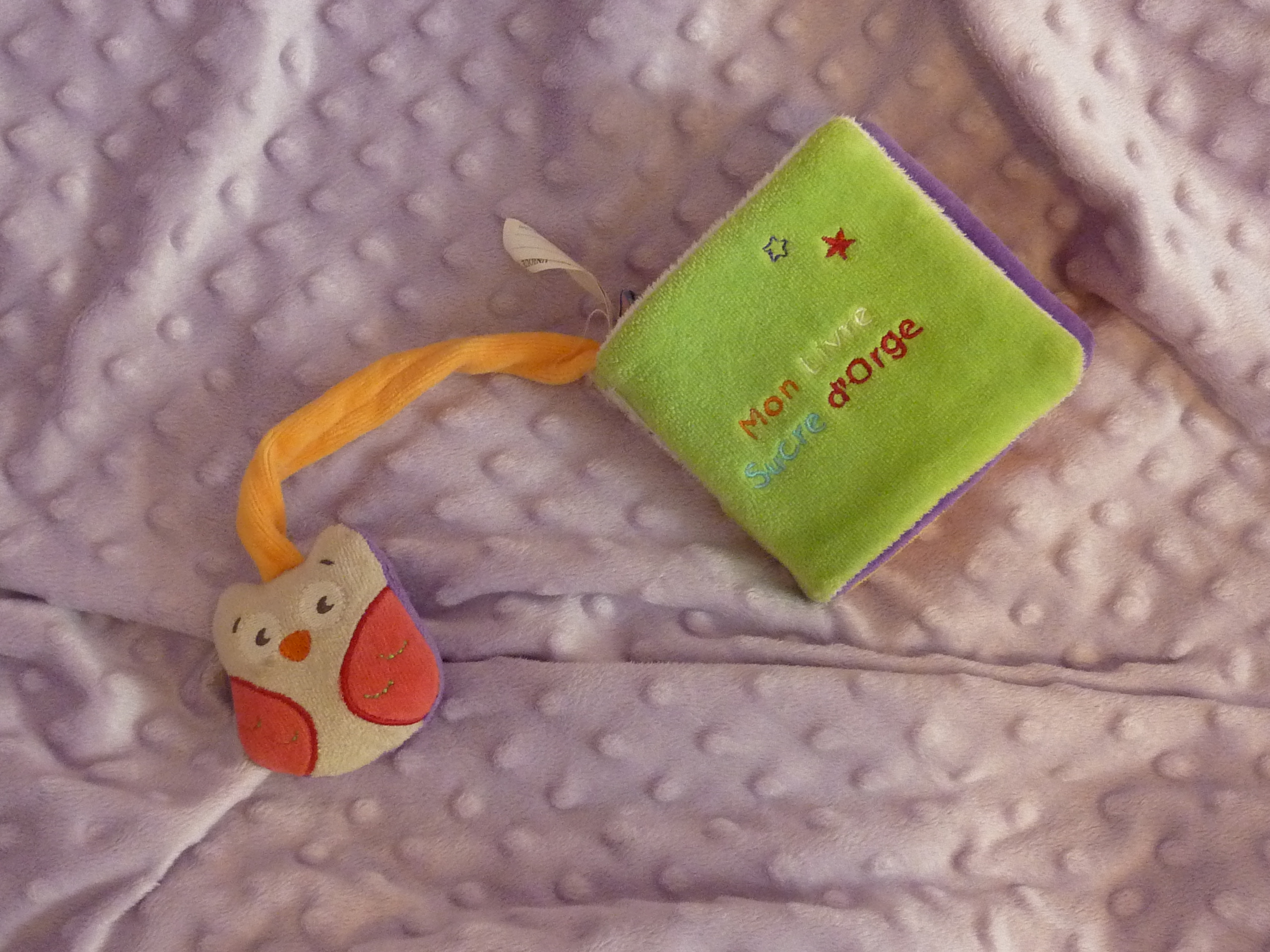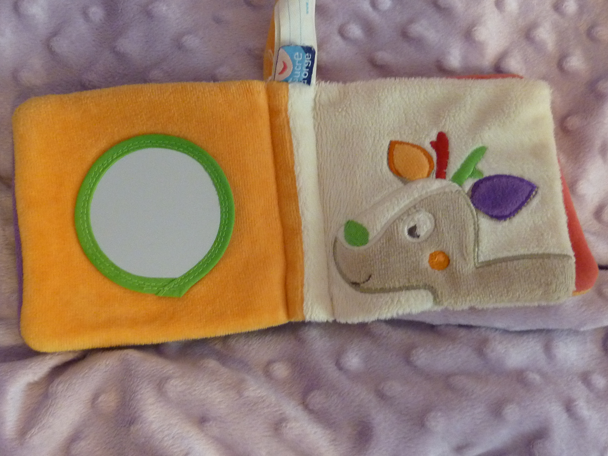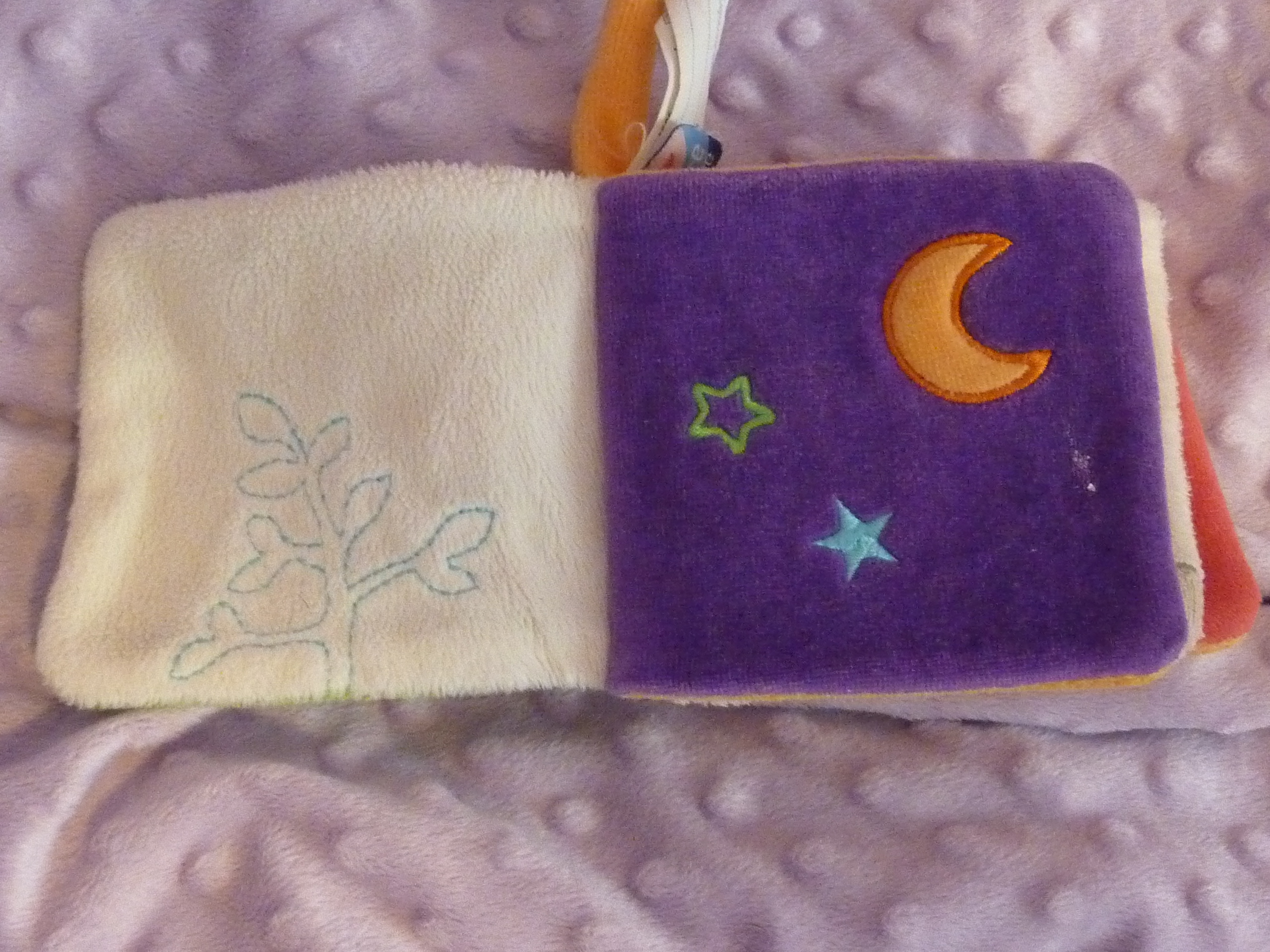 Nous aussi on avait un livre en tissu pour Bobo, celui d’une ferme avec un poussin qu’il fallait retrouver sur chaque page, cacher derrière de l’herbe qu’on pouvait recourber, derrière la porte de la grange qu’on pouvait ouvrir etc.. & une petit vache en chiffon accrocher pour office de petit doudou. Bobo adorait mâchouiller ce livre 🙂