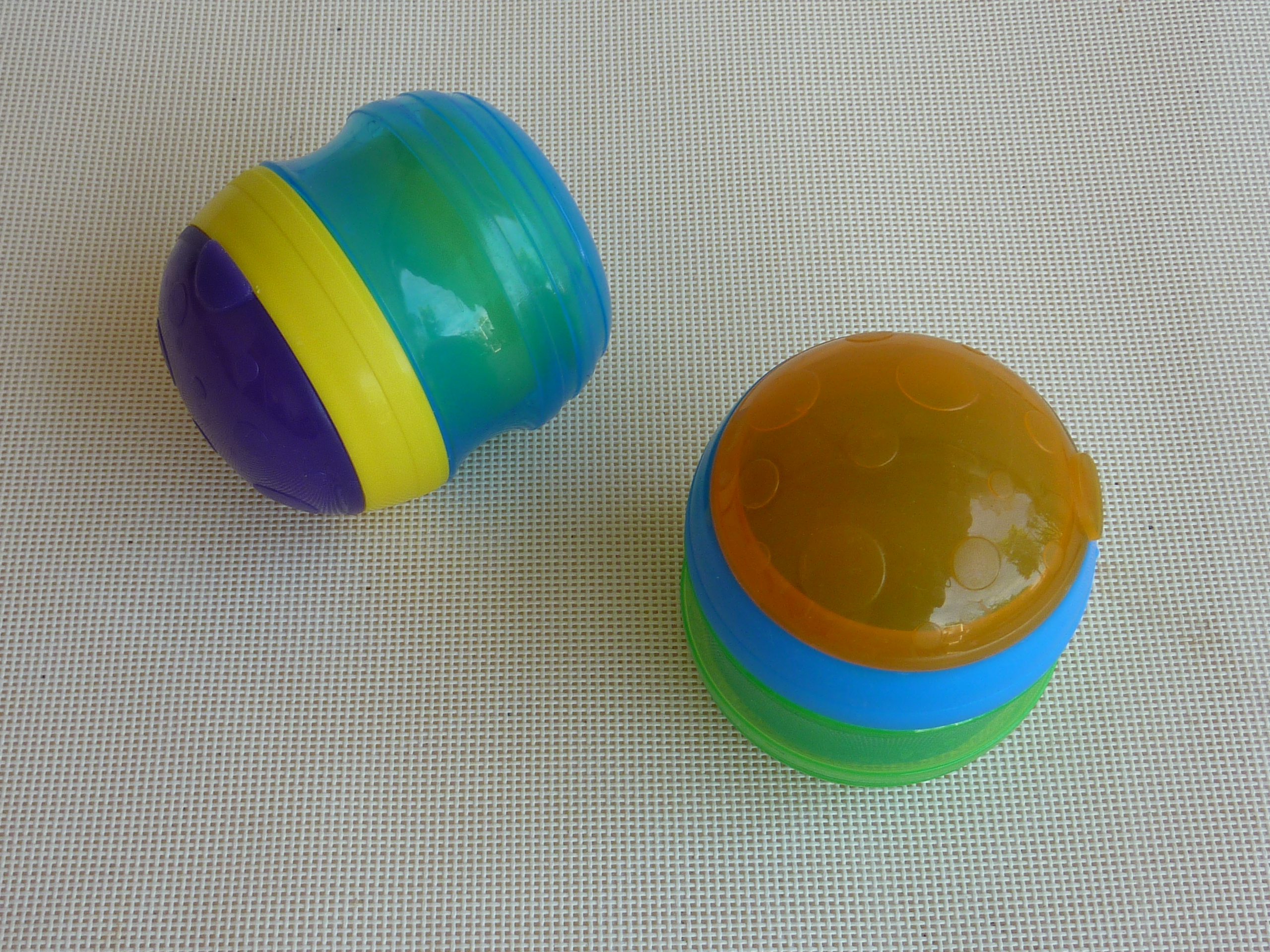 Comme j’ai constaté qu’elle n’avait pas l’air d’apprécier les compotes, j’ai essayé de mixer les fruits moi-même avec le babycook et la elle s’est mise à mieux en manger. J’ai retrouvé mes jolis petits pots pour les compotes maison de chez Béaba, au joli look acidulé.