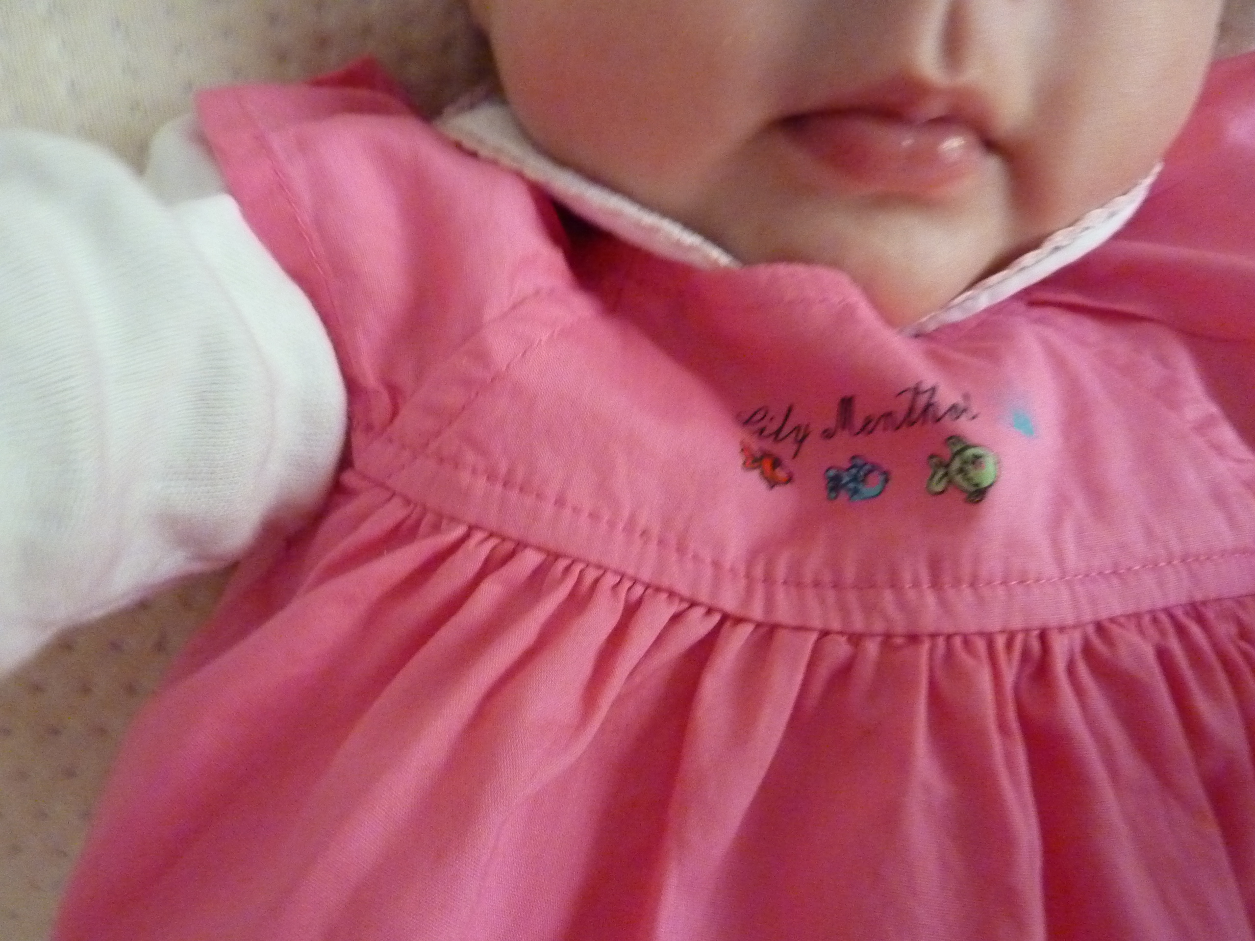 Le pantalon est trop joli et peut être porté longtemps mais le chemisier est déjà un peu juste, étriqué. Le pantalon est garni d’un ruban « Pois gourmand », il est de belle qualité. Le chemisier est élégant avec des rayures discrètes, des ronds et des fausses bretelles, effet faux ensemble salopette. Je trouve ce petit ensemble mimi et distingué, un peu l’habit du dimanche, pour changer des survêtements 3 pommes de couleur rose.