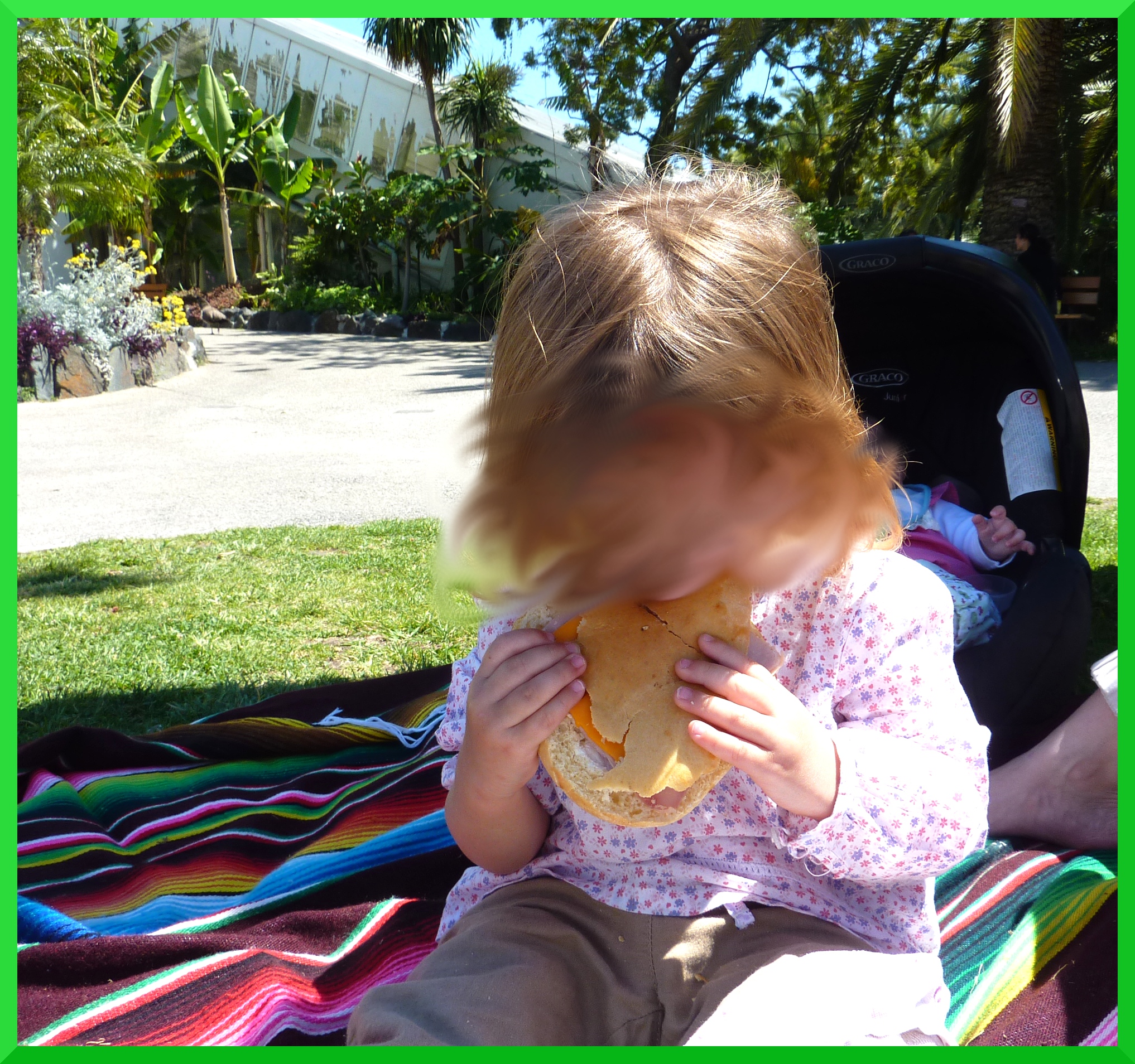Nous nous y sommes rendus munis de nos deux poussettes avec Puce et Choupinette. On a passé un moment agréable à se promener et à admirer les fleurs et les animaux. Puce s’est défoulée dans l’espace de jeux du fond, près de la serre, et on a pique-niqué sous un arbre tranquille, avec une Choupinette toute contente. Et la, le drame est arrivé.