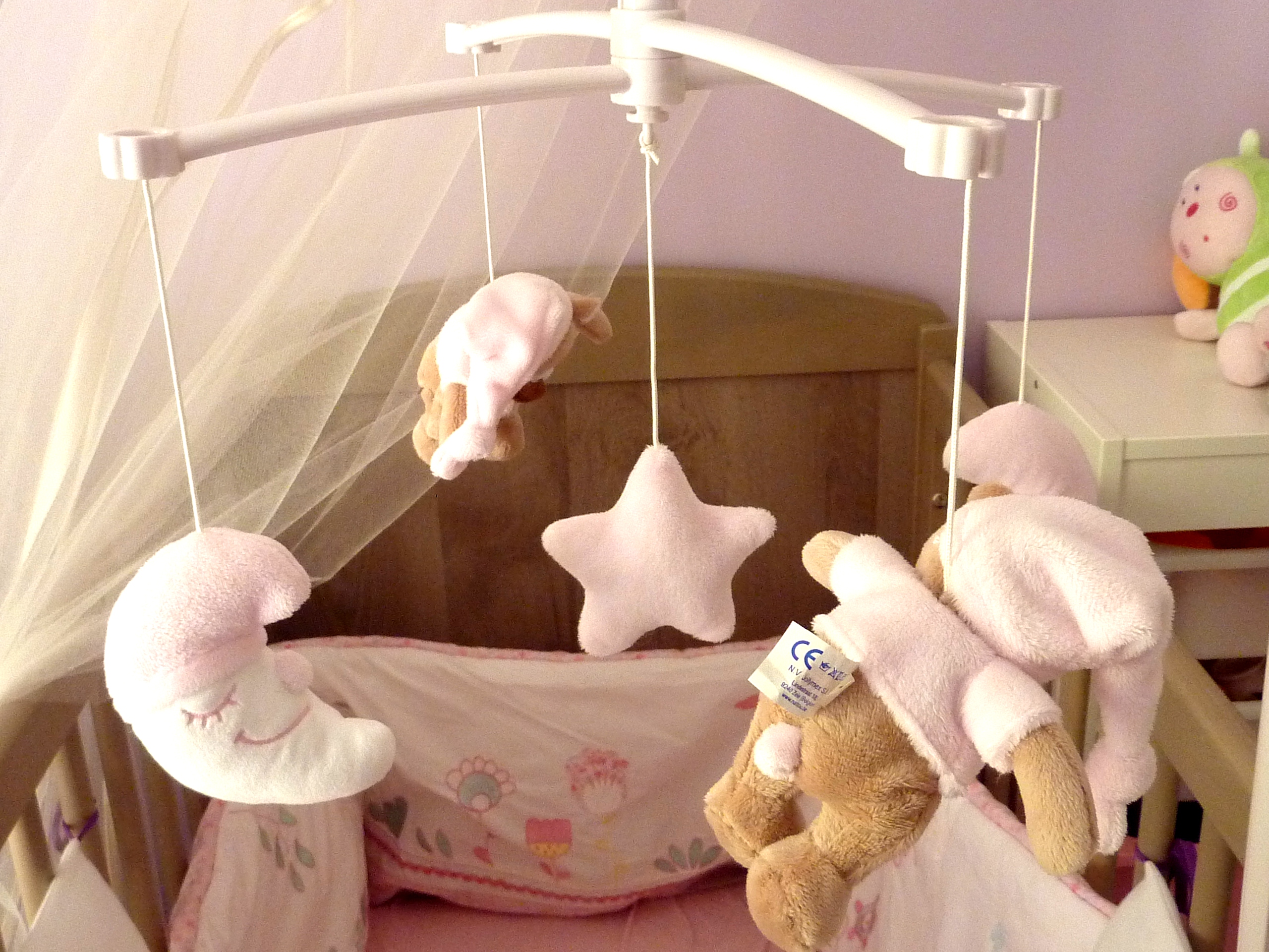 Un petit mobile tout simple aux couleurs pastels rose et beige que Choupinette aime regarder pour s’endormir à l’heure de la sieste. Pour compléter la panoplie des bonnes nuits, elle a des peluches Luminou qui s’illuminent, après avoir été placées sur une ampoule au préalable.