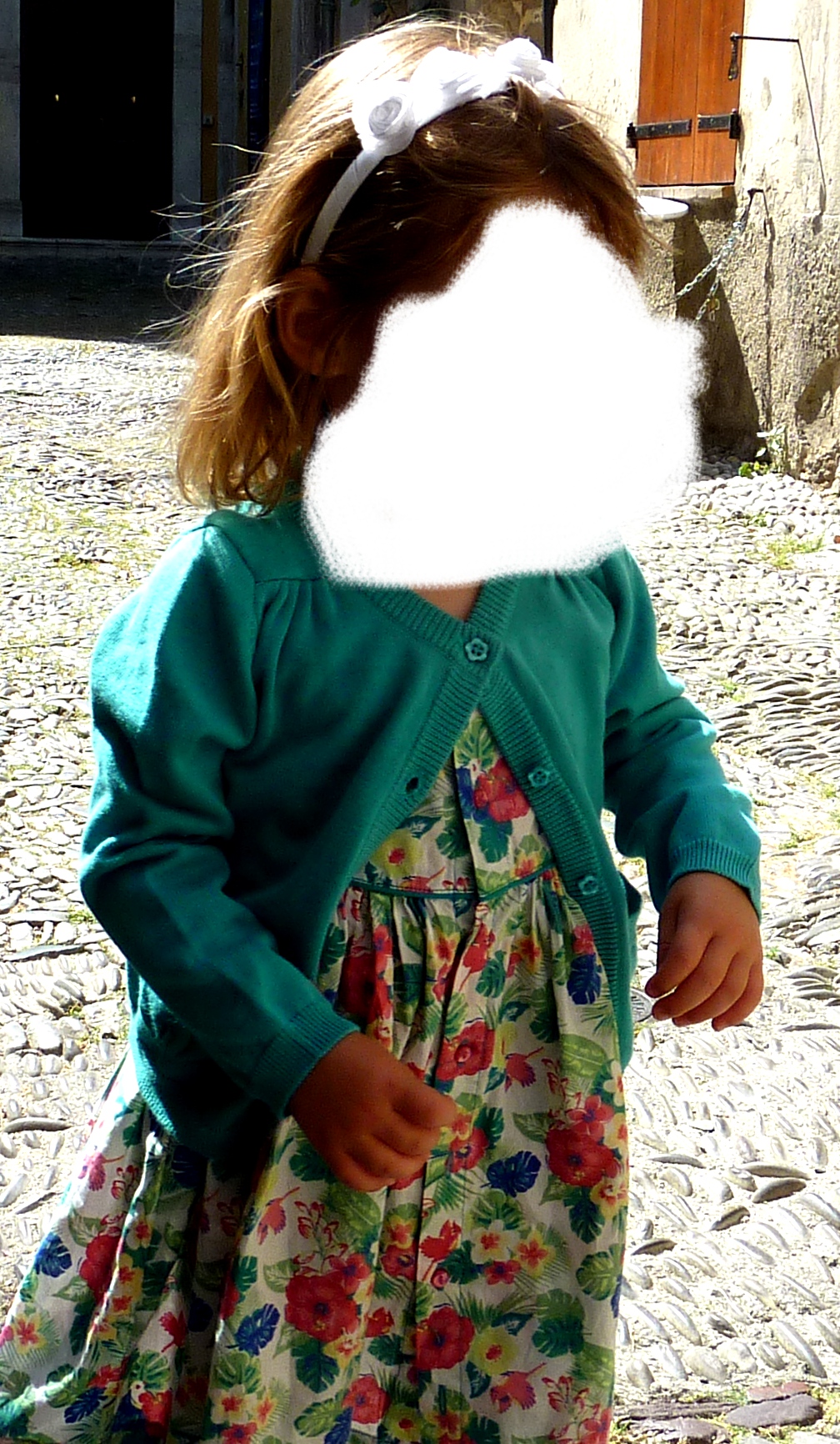Elle portait une robe très simple, basique, parfaite pour son âge, taille 12 mois de chez C & A, avec un bloomer blanc dessous, un petit bandeau blanc à pois noir avec un nœud rouge et des chaussettes blanches avec de la dentelle rose.