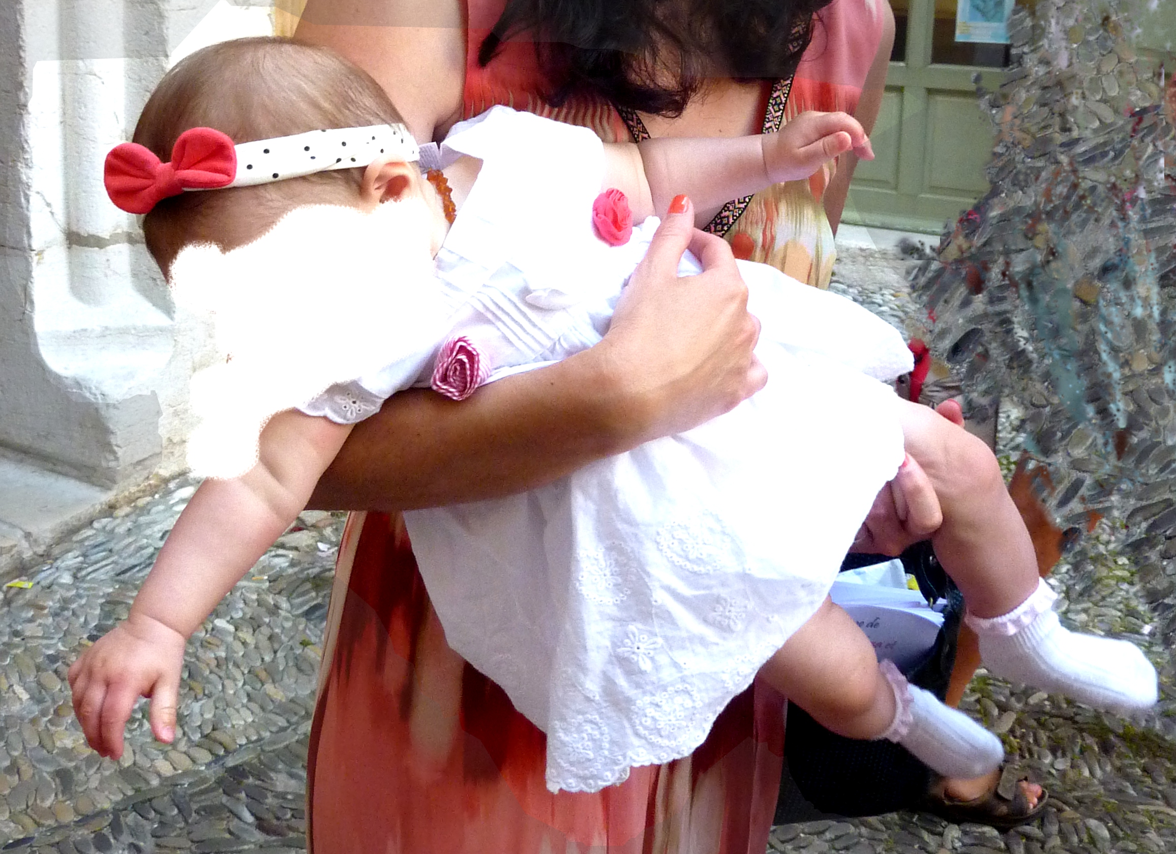 Je n’ai jamais acheté de vêtements C & A baby (Baby club) et je me rends compte que pour des occasions comme cela, et à cet âge la ou la taille varie tellement, les prix valent le coup: dans les 20€ la robe de baptême tout mimi. Pour Puce qui a été baptisée à 11 mois, j’avais opté pour une robe blanche et un gilet rose Sergent Major. Voici puce à 11 mois et à 4 pattes: