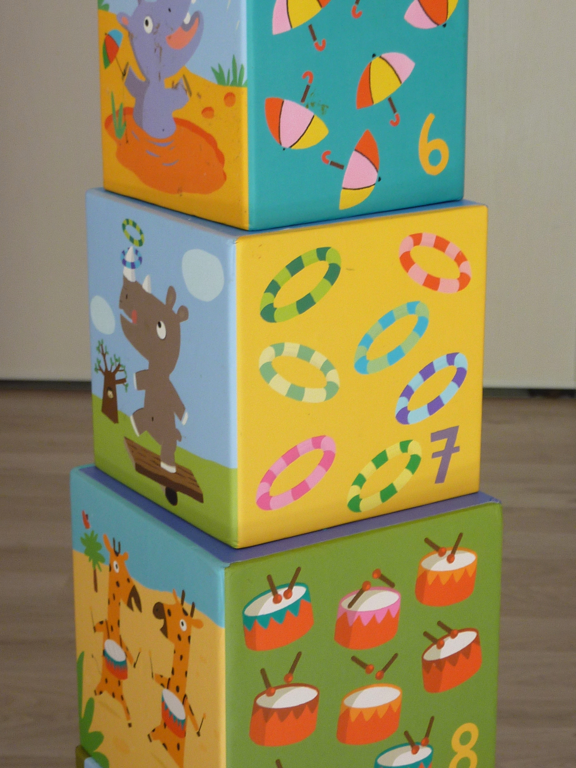 Quand nous allons à la ludothèque j’essaie de trouver un jeu qui pourrait plaire à Puce, facile à transporter et dont les pièces ne se perdent pas trop facilement. Celui-ci ressemble à un jeu que l’on a déjà chez nous (ci-dessous) mais avec un petit plus. Ces cubes peuvent bien sur s’empiler (cubes gigogne) mais ils servent aussi à se créer des histoires avec les petits animaux en plastique. Sur chaque cube est dessiné l’animal en question, et il a une double-fonction cube d’empilement et abri pour l’animal. L’enfant peut créer des ponts, des maisons et même un toit pour les personnages. Elle n’y joue pas des heures pour le moment mais aime bien le principe et surtout manipuler le tout. Je lui laisse à disposition dans le salon dans la boite et elle le prend quand elle veut. Le plus développement: l’imagination (des parcours à imaginer), la motricité fine et la coordination. Les cubes sont bien solides en prévision des multiples manipulations et colorés. Age: 18 mois +.