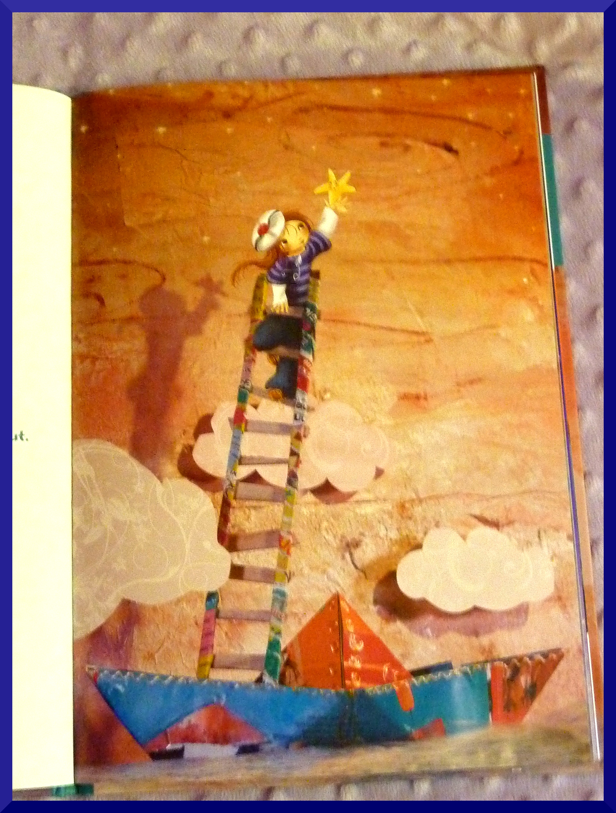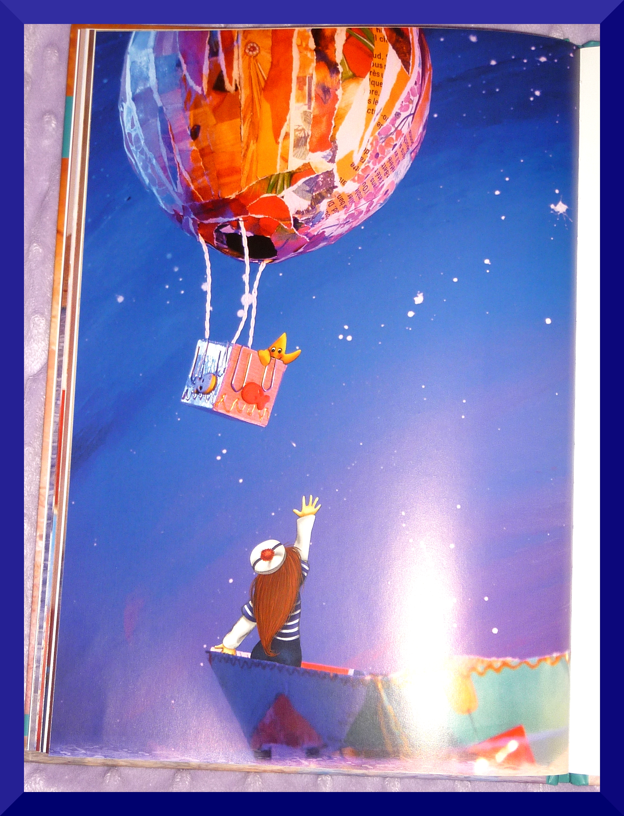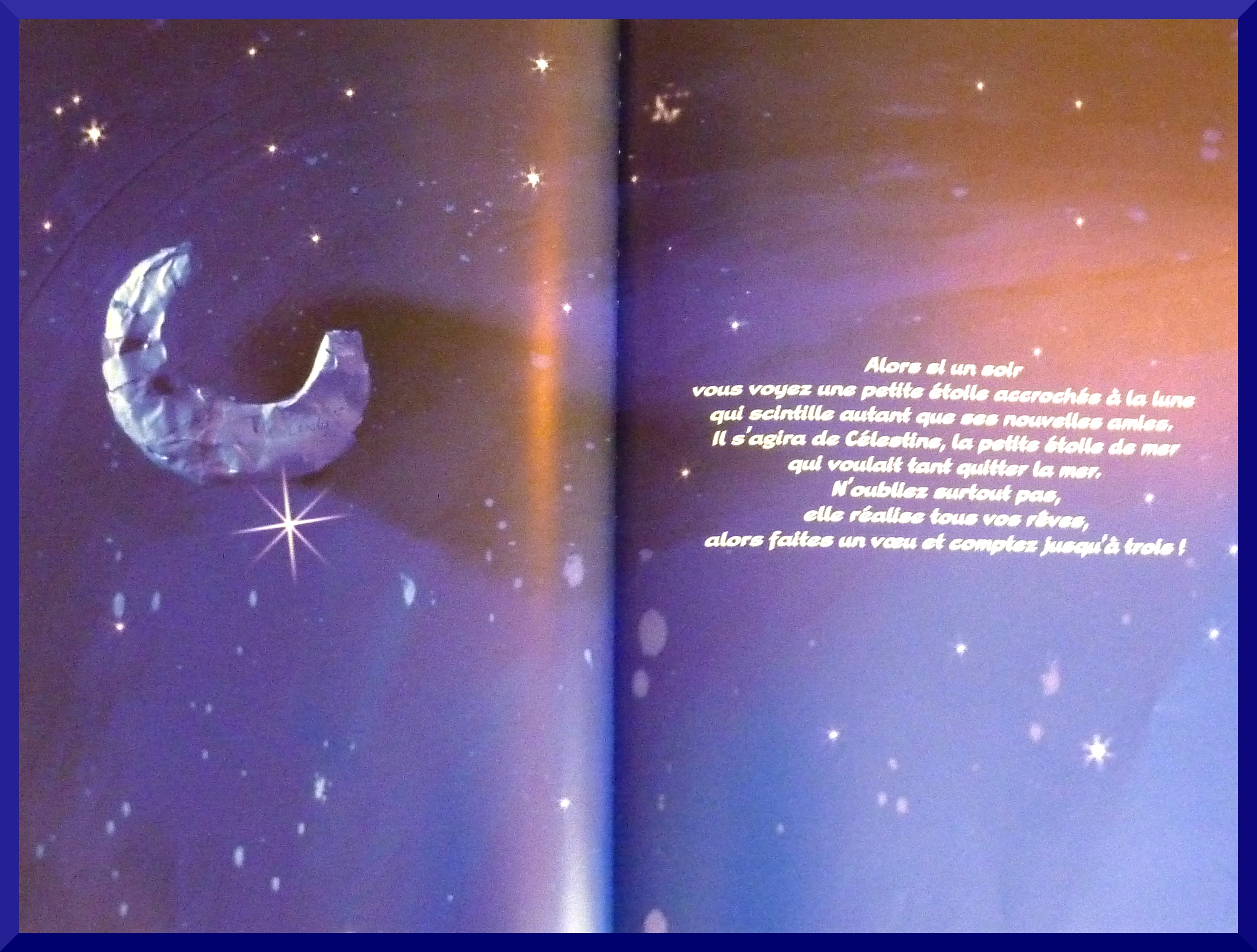L’histoire: un peu du genre d’inspiration des contes classiques ou de la Fontaine, par exemple le rat qui voulait être roi,  je crois? Ici c’est l’histoire de Célestine l’étoile de mer qui voulait tout simplement être une étoile dans le ciel, une star. Elle s’ennuie dans l’océan et rêve d’ailleurs. Elle rencontre Coraline qui navigue sur un bateau en papier on dirait, de ceux que l’on pourrait réaliser à la main. Elle lui demande de l’aider à réaliser son rêve, Coraline la hisse à bord avec son épuisette. Célestine lui promet d’être sa bonne étoile si elle arrive à atteindre le ciel. Après plusieurs essais infructueux: l’étoile monte tout en haut du mat, puis en haut d’une échelle, mais ce n’est pas assez haut; Coraline décide de lui coudre une montgolfière (en papier mâché?). L’étoile s’envole et atteint la lune. Elle se pose là-haut et brille dans le ciel. Elle porte chance!