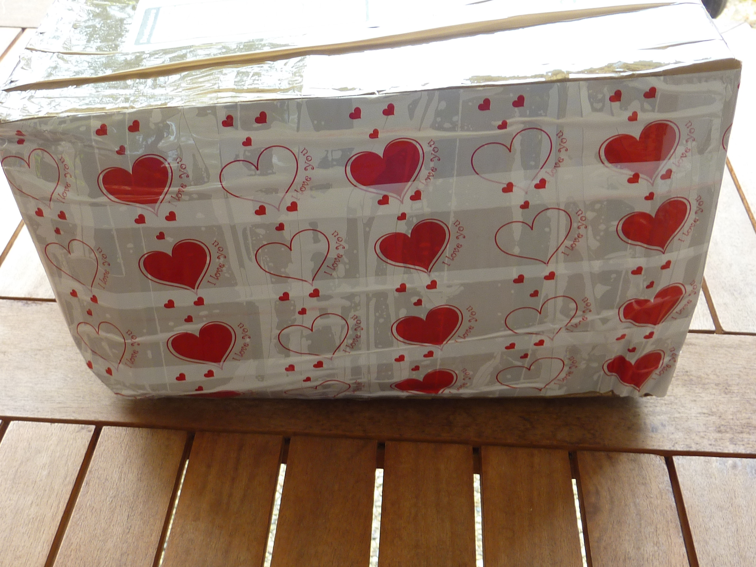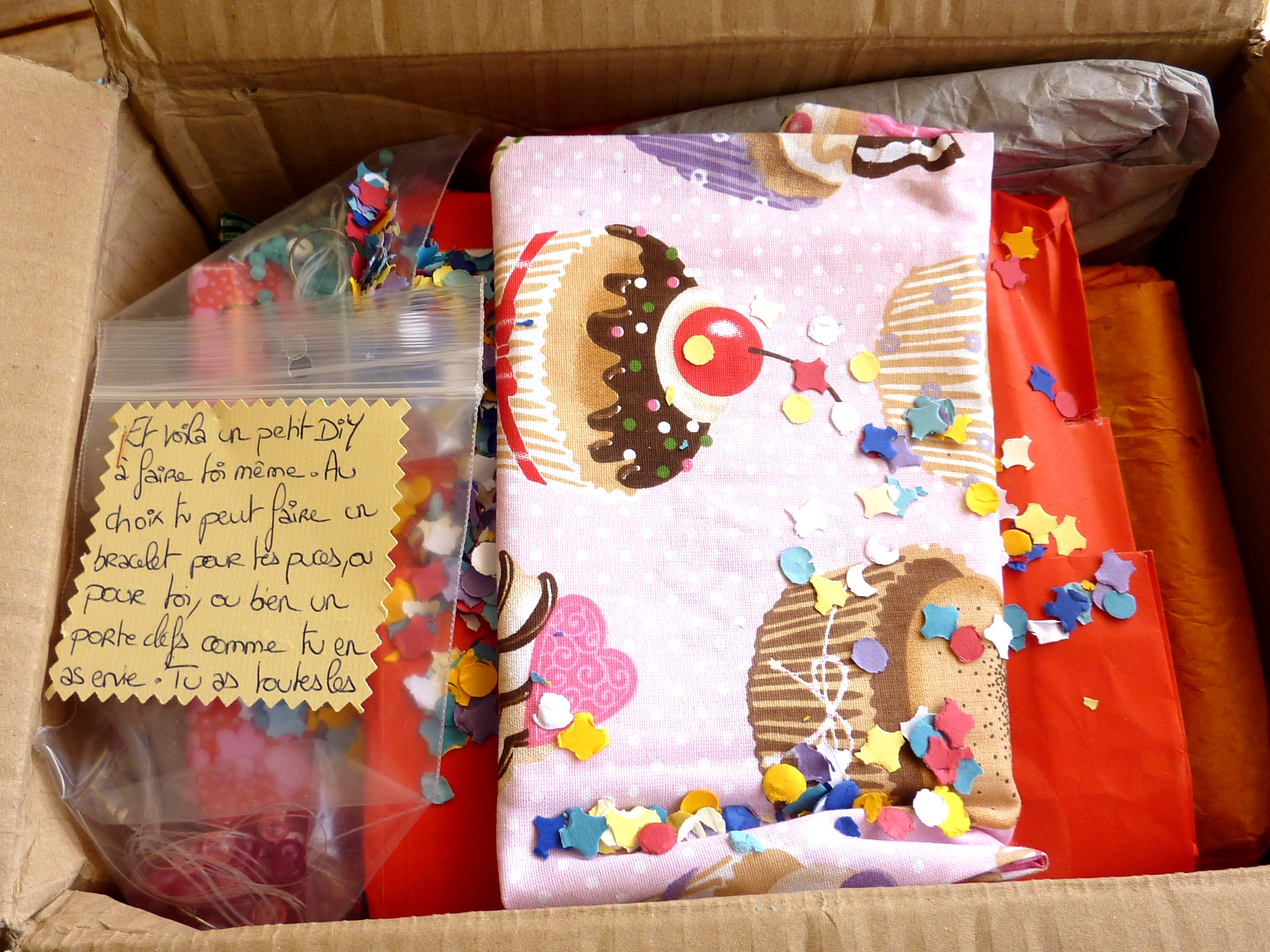 De mon coté j’ai été HYPER gâtée par Aurélie que je remercie chaleureusement. Tout d’abord visez un peu ça, un joli colis avec des cœurs et à l’intérieur une tonne de confettis.