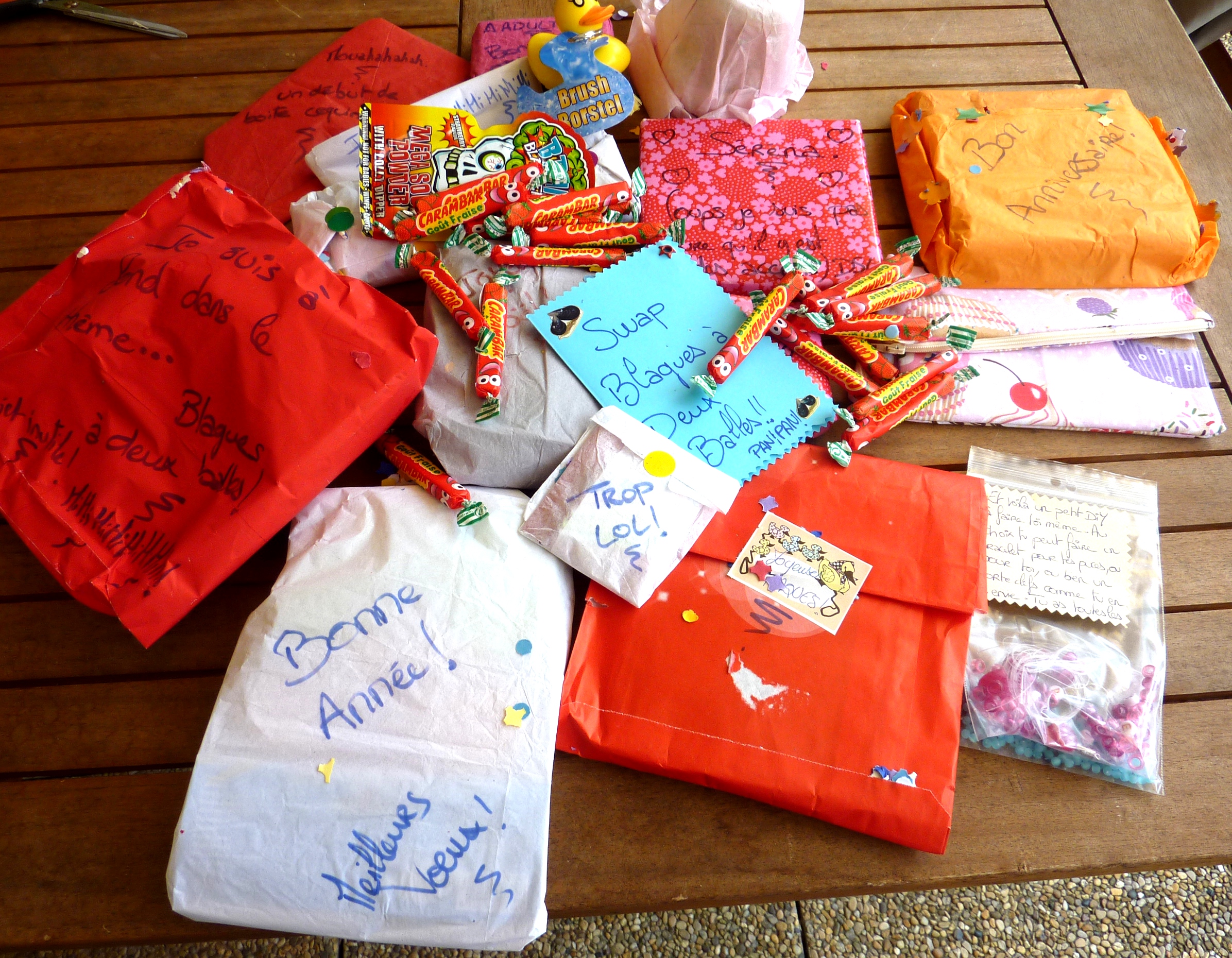 Des petits mots sur les paquets rappelant le fil des fêtes de l’année et la thématique : bonne année, bon anniversaire, des paquets pour les filles, des DIY, …