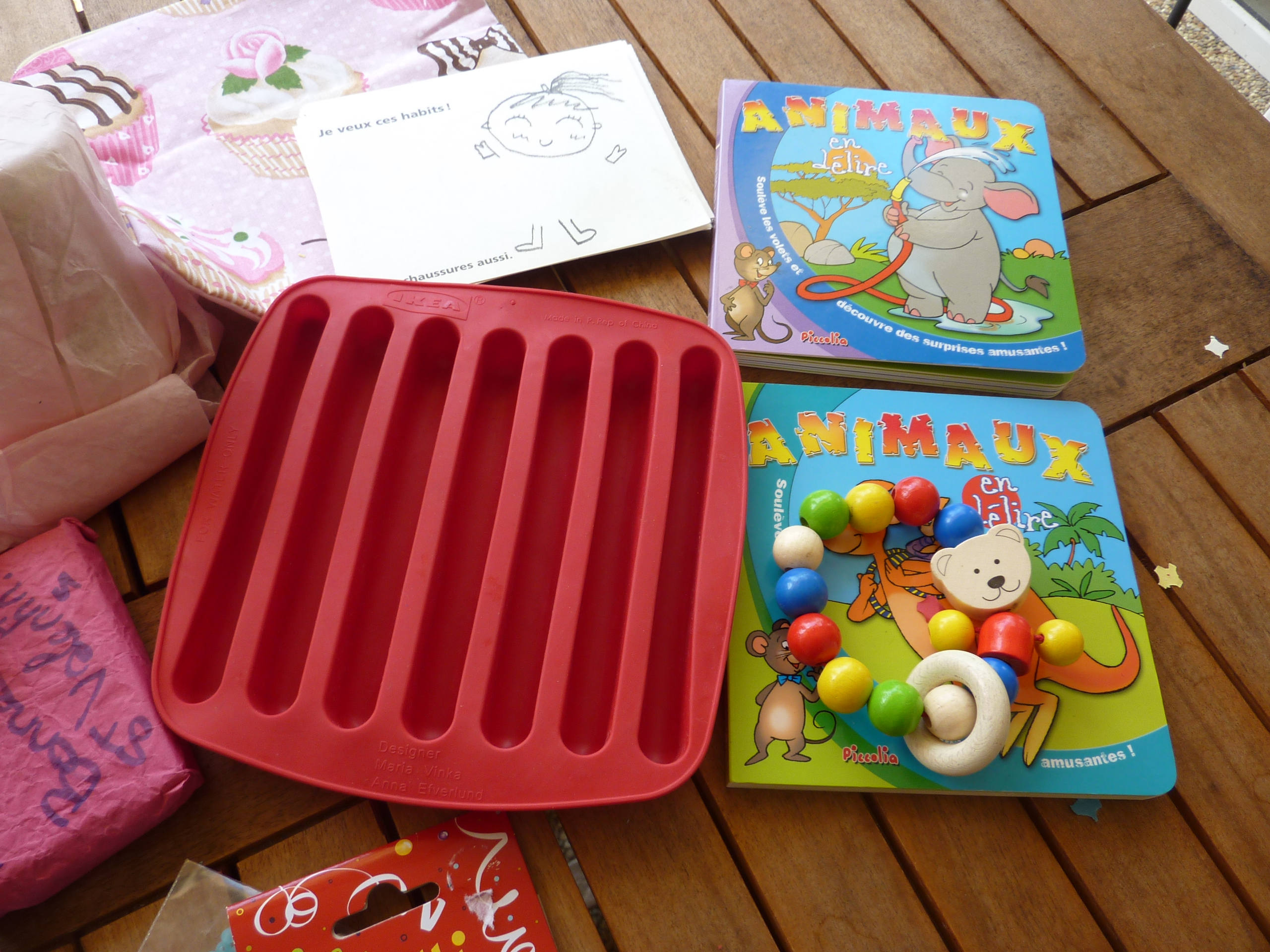 • des stickers pour son fils, un pistolet à eau, des bulles de savons, une grenouille de bain;