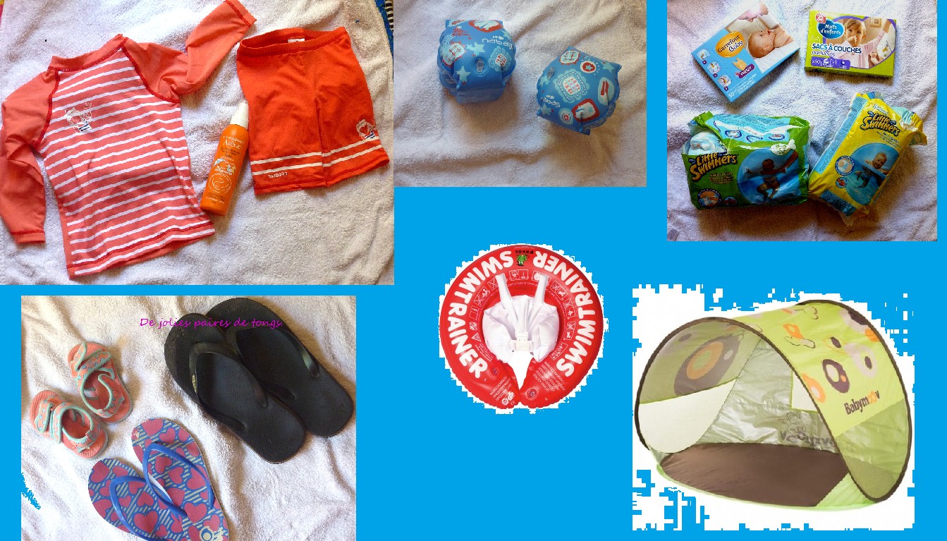 - Le maillot de bain bien sur, et surtout pour le mois d’août et se rendre à la plage plus tranquillement sans craindre les coups de soleil: le t-shirt anti-uv (ici)pour Puce et une combinaison pour Choupinette. Sans oublier la crème solaire (dans la partie 3)
