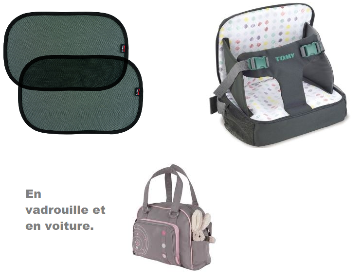 - Un réhausseur nomade de chez Tomy qui sert aussi de sac à langer. Pratique sur les aires d’autoroute ou pour diner chez des amis.