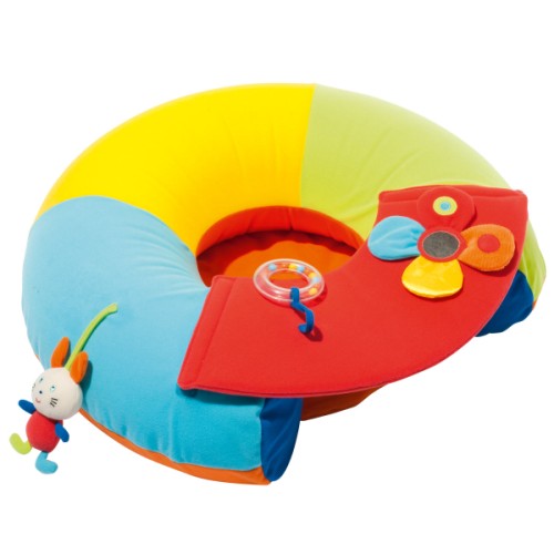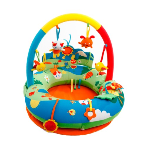 Choupinette l’utilise chez chez ses Riviera grands-parents. Comme le premier il est bien large. Nous les avons achetés sur le site d’Oxybul éveil et jeux. Par rapport au premier, il équipé de plus d’activités à effectuer sur le ventre, à 4 pattes ou assis : fleurs à froisser, pétales bruissantes, miroir kaléidoscope, une maison où l’on fait passer une balle qui ressort de l’autre côté. La dernière activité est pile poil adaptée à l’âge de Choupinette. Elle adore les balles en ce moment. Les couleurs sont vives et il y a un grand personnage souriant (un épouvantail) dessiné dessus.