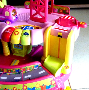 Qui a dit que certains jouets étaient destinés aux filles et d’autres aux garçons ? Vtech a inventé le garage pour filles de couleur rose et fushia : les Tut tut bolides ! Puce l’a reçu en cadeau pour ses 2 ans en avril. Elle l’a surtout adopté cet été ainsi qu’une autre voiture (de sport s’il vous plait!) de chez Oxybul Eveil et jeux.