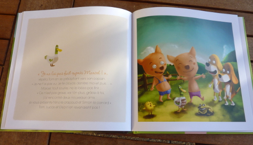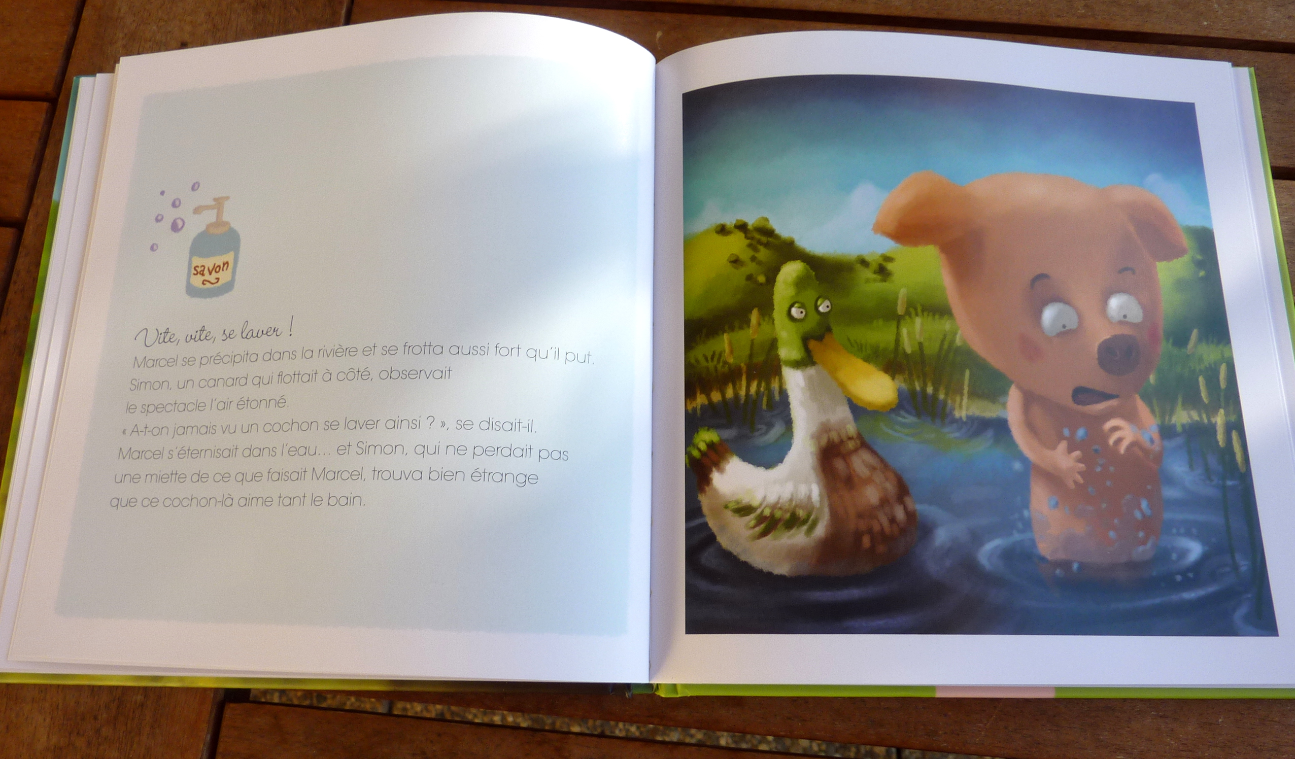 L’histoire : Marcel est un cochon « coquet » aux manières délicates qui n’aime pas se salir. Il n’aime pas comme sa sœur se jeter dans la boue, comme tous les cochons. Il déteste se salir le groin pour manger et préfère les délicates manières de la famille poule. Un jour ses amis les chiots, Lucas et Tom, viennent jouer avec lui à la ferme. Tom le pousse dans la boue en voulant imiter le grand méchant loup. Marcel tombe, se salit et c’est le drame. Il découvre alors les joies du bain dans le lac. Il rencontre deux nouveaux amis, Nono le crapaud et Simon le canard. Depuis ce jour, Marcel est heureux de jouer dans la boue pour avoir la joie de se laver ensuite.