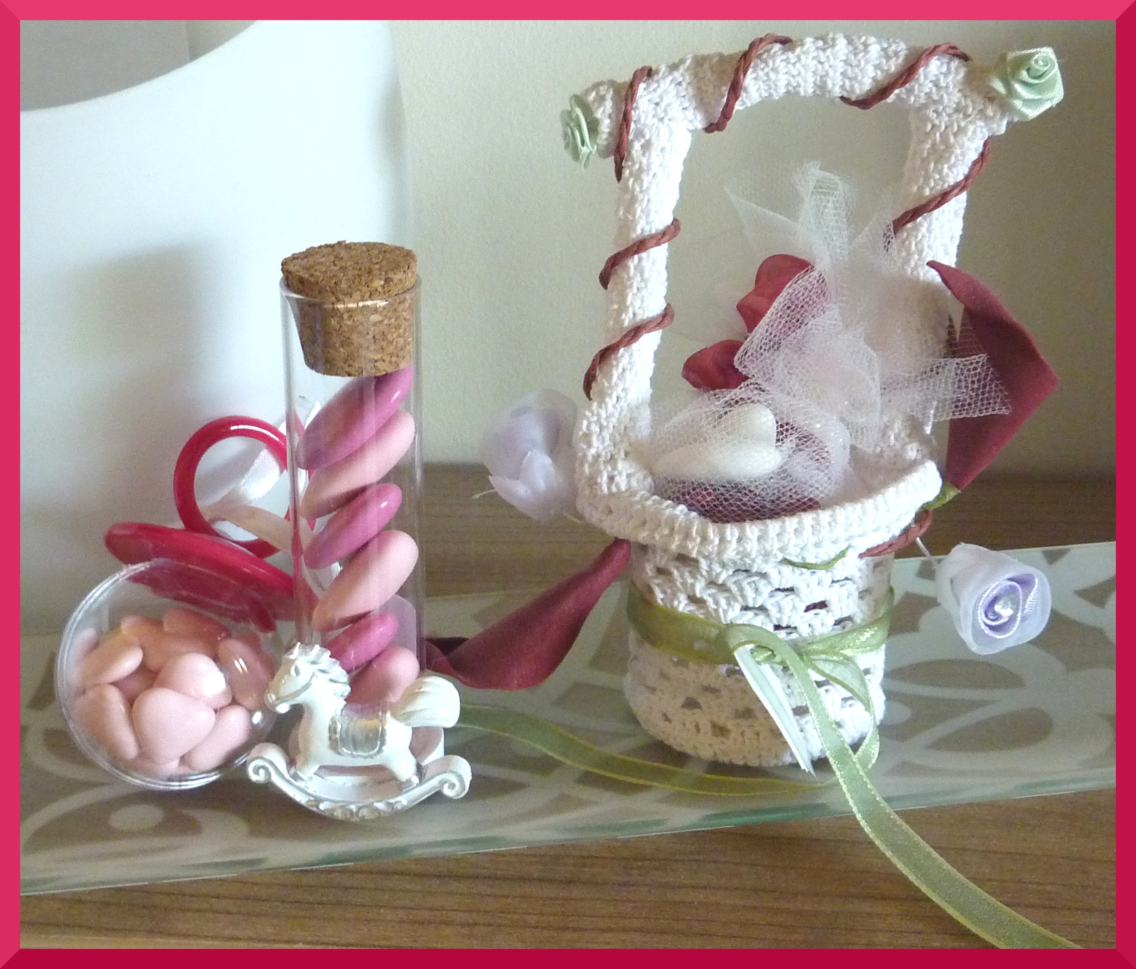 Des tranches de vie en dragées. Pour mon mariage je n’en voulais pas, je trouvais que c’était rétro, nul, dépassé. L’une de mes cousines m’a proposé de fabriquer elle-même les pochons, alors je me suis dit pourquoi pas. Je la remercie car déjà ils étaient très réussis et c’est vrai que ça laisse un beau souvenir. Pour nos invités, nous avions donc prévu un pochon de dragées aux couleurs du mariage (vert,bordeaux) et une bouteille de vin, joliment emballée, du lieu qui nous accueillait pour la fête du soir dans le Var, un domaine viticole magnifique. Je suis sympa, je vous donne l’adresse : Le Château Mentone (ici). Ca pourrait servir!